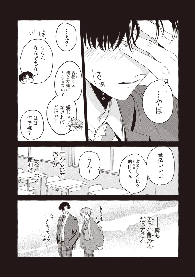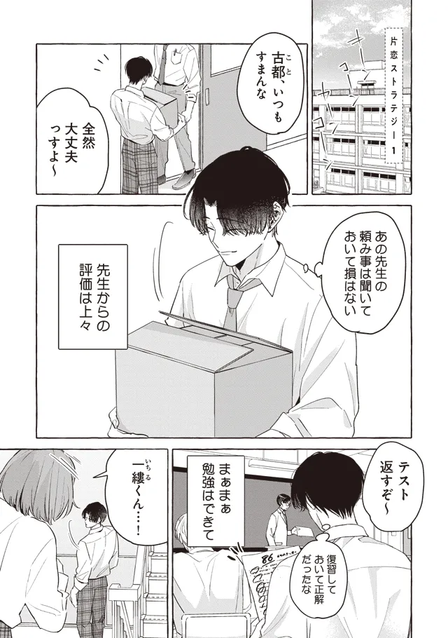 先生からの評価は上々。まあまあ勉強はできて背もそこそこあって少々モテる。友達もそれなりにいるし充実している高校生活に何ら不満はない。一縷は勇気に恋をしていた。しかし一方勇気はノンケを好きになっては告白しては振られてを繰り返している。そんな勇気をなだめる一縷。一縷はいっそ勇気が自分のモノになって欲しいと思いながらも密かに勇気の恋を応援している。「恋しているお前に恋してるなんて―」勇気が知らない誰かと話してる。その男は、変な噂が絶えない。この恋だけは応援できそうにない。勇気とあいつに取られるわけにはいかな―。