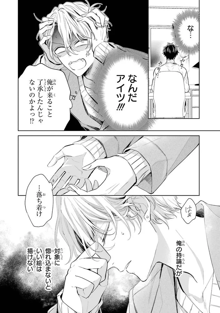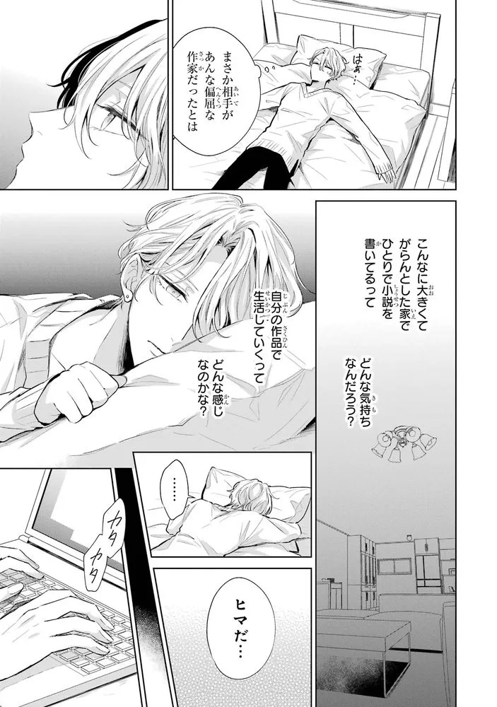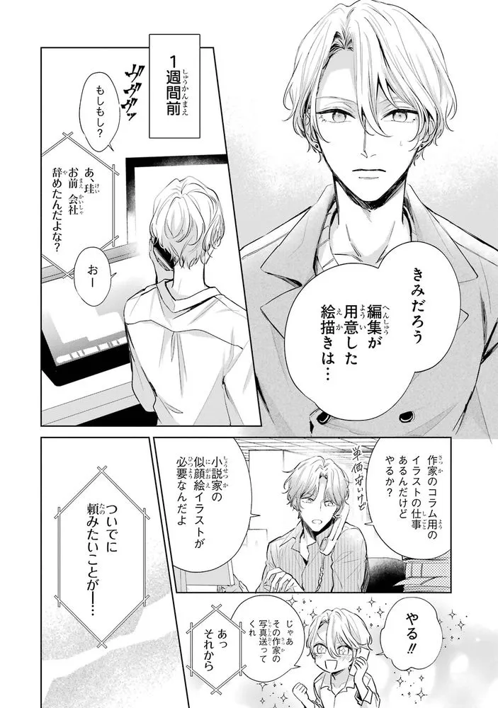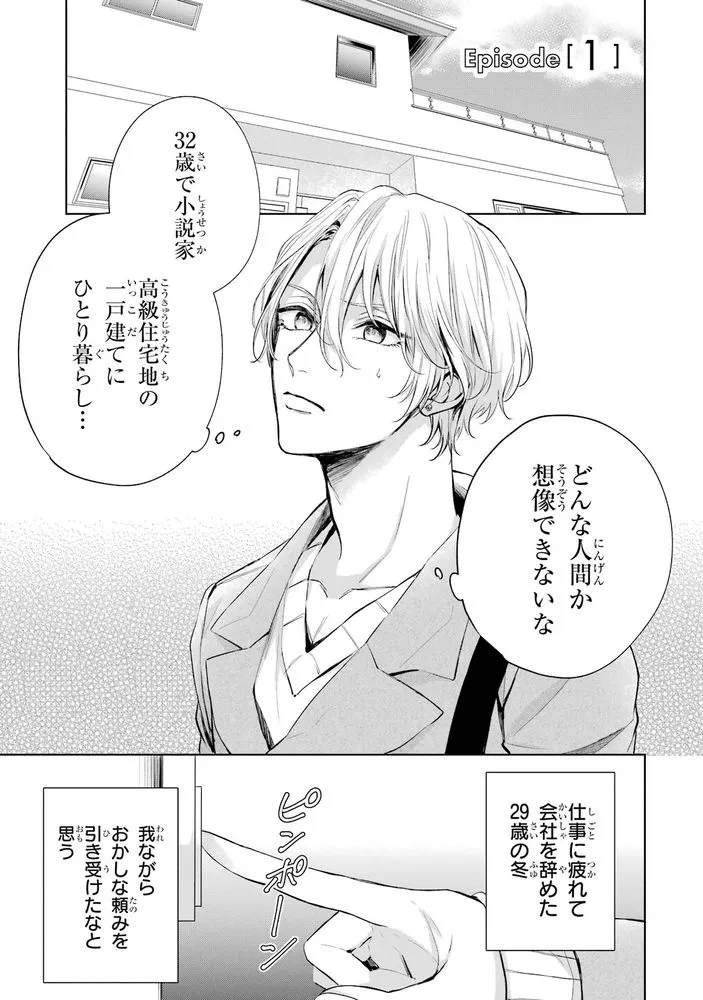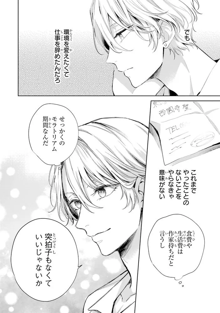 社会性ゼロの小説家と、モラトリアム真っ只中の絵描き。正反対な二人の、少し不器用な同居生活が始まる。会社を辞め、自分の将来について立ち止まっていた絵描きの珪(29)。知り合いの編集者から頼まれたのは、小説家・**西園寺聖(32)**の似顔絵を描くこと、そしてなぜか「仕事ぶりを見張るために家に泊まり込んでほしい」という突拍子もない依頼だった。三十二歳で売れっ子小説家、しかも高級住宅地の一戸建てに一人暮らし。どんな人物なのか想像もつかないまま訪ねた聖の家で、珪を待っていたのは、露骨に迷惑そうな態度と冷たい対応だった。居心地の悪さを感じながらも、せっかくのモラトリアム期間だからこそ、新しい環境に飛び込むと決めた珪。たとえ相手が扱いづらい人物でも、きちんと向き合おうとする。そんな中で珪は、聖が人と距離を置く理由、そして彼の内側にある不器用な優しさに気づいてしまう。不愛想で、いつも仏頂面の小説家。静かな時間の中で育っていく、同居BLストーリー。