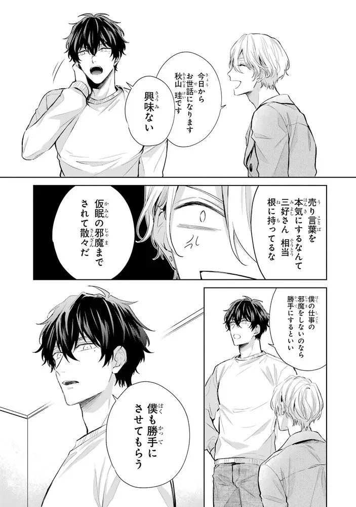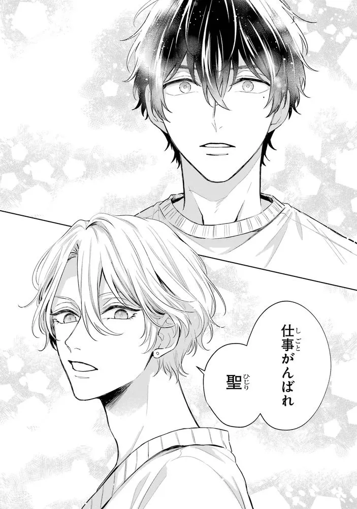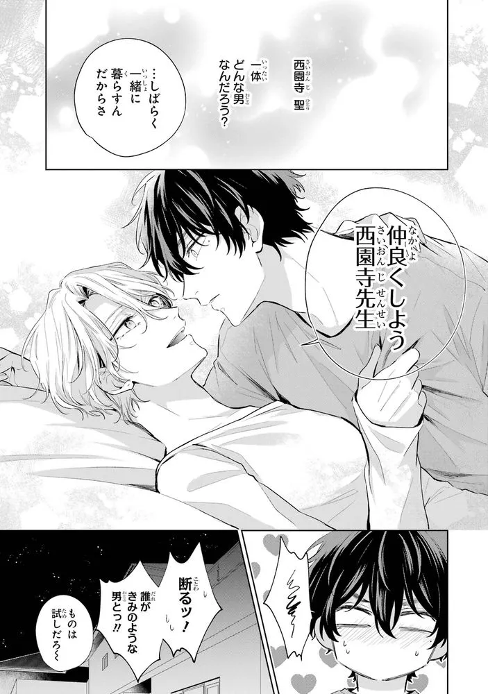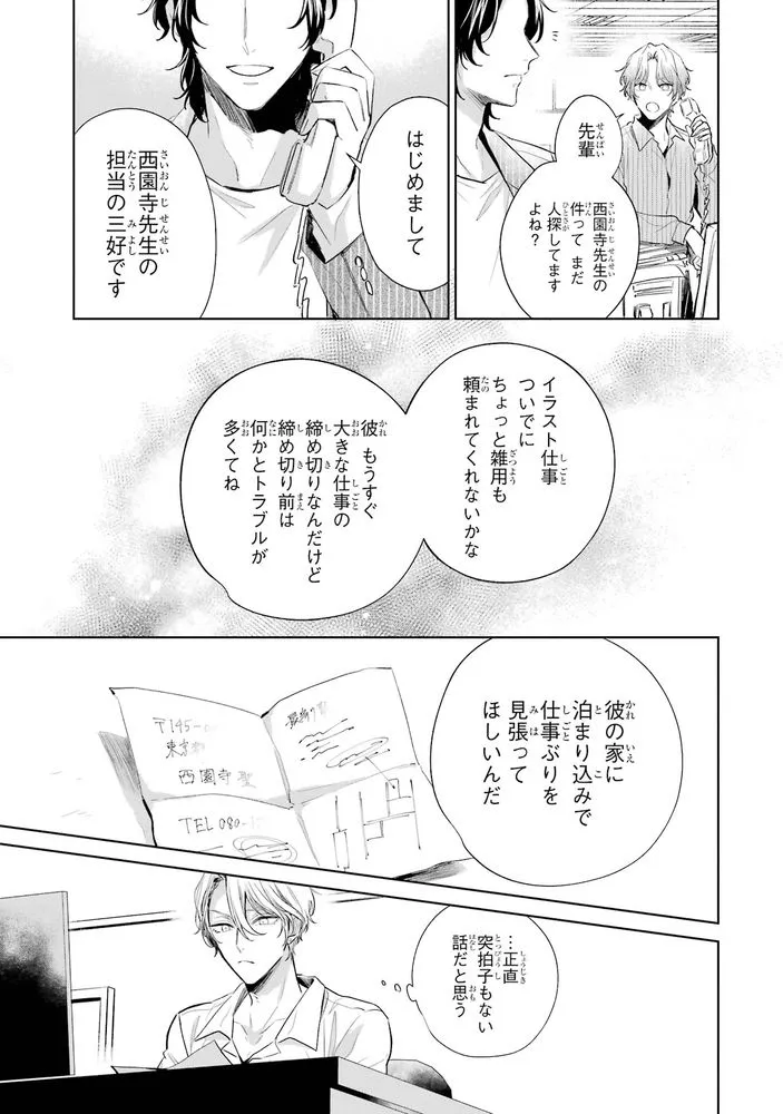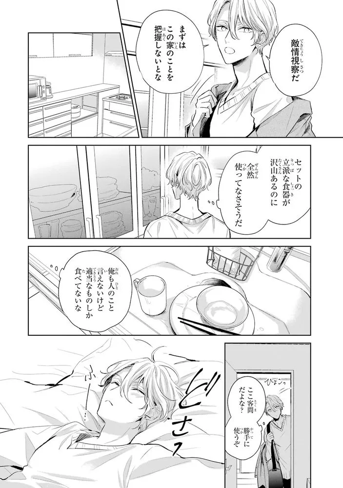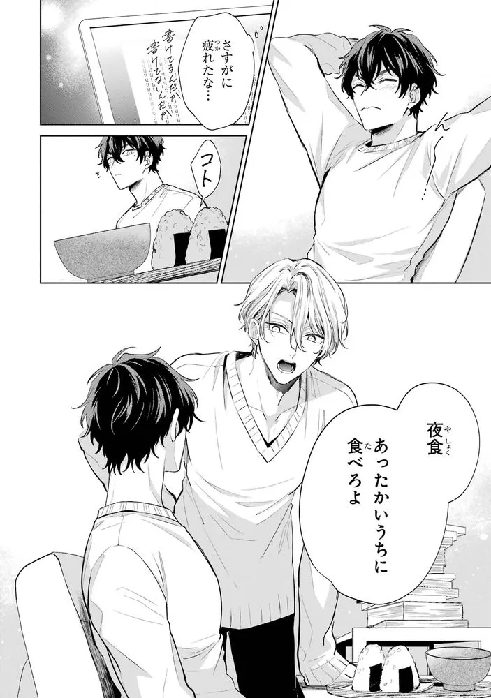 社会性ゼロの小説家と、モラトリアム真っ只中の絵描き。正反対な二人の、少し不器用な同居生活が始まる。会社を辞め、自分の将来について立ち止まっていた絵描きの珪(29)。知り合いの編集者から頼まれたのは、小説家・**西園寺聖(32)**の似顔絵を描くこと、そしてなぜか「仕事ぶりを見張るために家に泊まり込んでほしい」という突拍子もない依頼だった。三十二歳で売れっ子小説家、しかも高級住宅地の一戸建てに一人暮らし。どんな人物なのか想像もつかないまま訪ねた聖の家で、珪を待っていたのは、露骨に迷惑そうな態度と冷たい対応だった。居心地の悪さを感じながらも、せっかくのモラトリアム期間だからこそ、新しい環境に飛び込むと決めた珪。たとえ相手が扱いづらい人物でも、きちんと向き合おうとする。そんな中で珪は、聖が人と距離を置く理由、そして彼の内側にある不器用な優しさに気づいてしまう。不愛想で、いつも仏頂面の小説家。静かな時間の中で育っていく、同居BLストーリー。