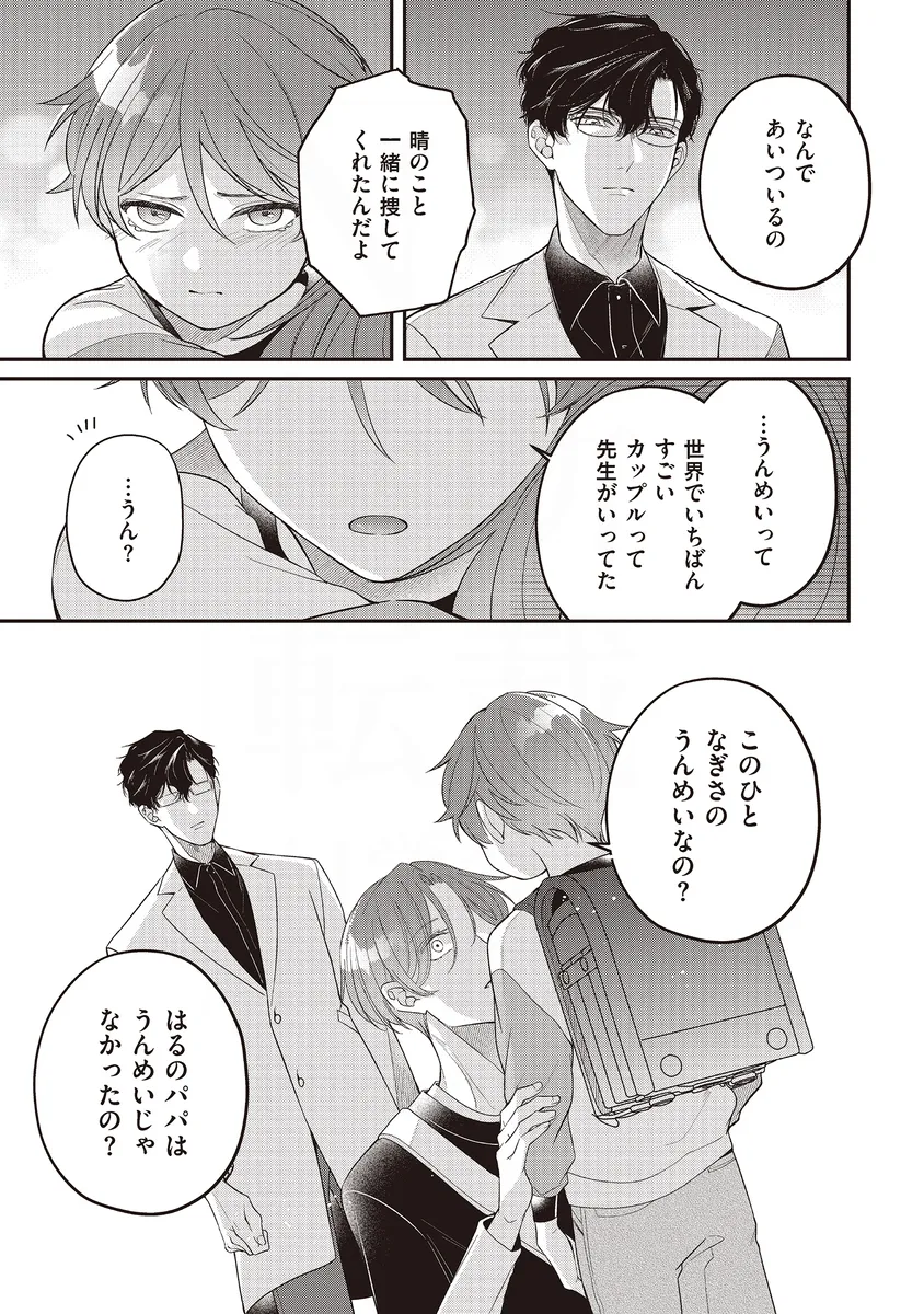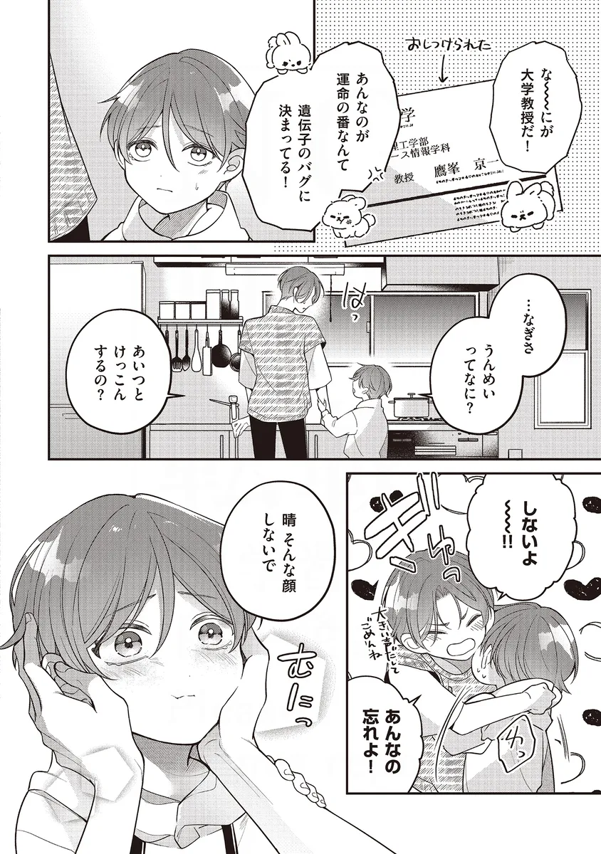 元カレに裏切られたΩの渚は、幼い息子・晴と支え合いながら生きてきた。もう恋もしない、番もいらない――そう心に決めていたはずなのに、引っ越し先で“運命のα” 鷹峯と出会ってしまう。ときめきは一瞬。間髪入れずに飛び出したノンデリなプロポーズに、渚は怒りを爆発させる。それでも鷹峯は諦めない。不器用なまま、渚と晴に真っ直ぐ向き合い続けた。三人で出かける夏祭り。自転車の練習に付き合う夕暮れ。重ねる日常の中で、渚の胸には捨てたはずの想いが、静かに芽吹いていく。ノンデリα × 苦労人Ω + しっかり者の息子。家族になるまでの距離が、じんわりと心をほどくオメガバース。