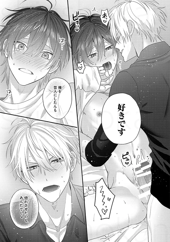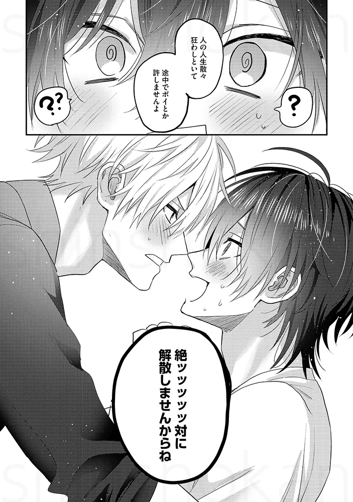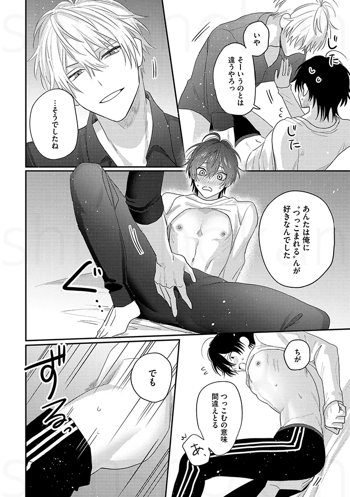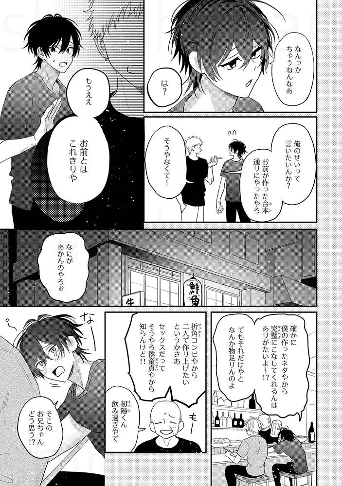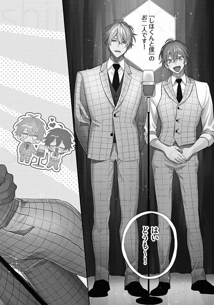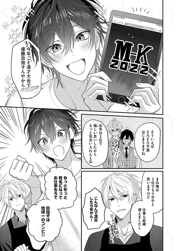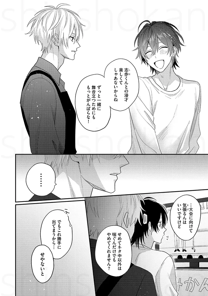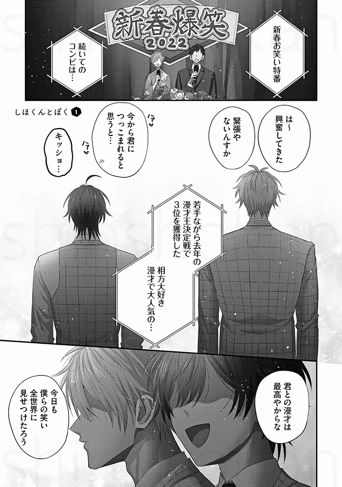 「俺を芸人にしたんも惚れさせたんも、あんたでしょ」お笑いコンビでBLセックス。チンポとチンポをごっつんこさせて擦り合わせる。アナルに指を入れて前立腺を刺激してビクンと絶頂。「解散なんて、絶対にさせへん」“相方大好き漫才”で注目を集める若手お笑いコンビ「しほくんと僕」。ボケ担当の初陽と、クールなツッコミ・志歩は、次の漫才大会での優勝を目指し、日々コンビとしての完成度を高めていた。そんなある日、マネージャーの指示で、初陽は志歩に“解散ドッキリ”を仕掛けることになる。クールで感情を見せない志歩なら、あっさり受け入れてしまうのでは――そう不安に思いながらも、初陽は意を決して切り出す。「……俺たち、解散しようか」