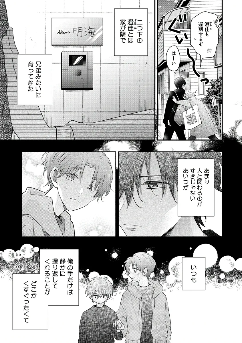 幼いころから家が隣同士で、兄弟のように一緒に育ってきた澄佳と晴流。面倒見がよく優しい晴流に対し、澄佳はいつもどこか距離を感じながらも、彼のそばにいる時間を当たり前のように過ごしてきた。高校生になり、それぞれの日常を送りながらも続く関係。けれどある日、再会した晴流の雰囲気はどこか以前と違っていて、澄佳は戸惑いながらも目を離せなくなる。穏やかだったはずの関係は少しずつ変化し、ただの幼なじみではいられない想いが芽生えていく。長い時間を共有してきた二人の距離は、ある出来事をきっかけに大きく動き出す。幼なじみだった関係が、やがて特別な想いへと変わっていく――そんな二人の恋の行方を描いたBLストーリー。