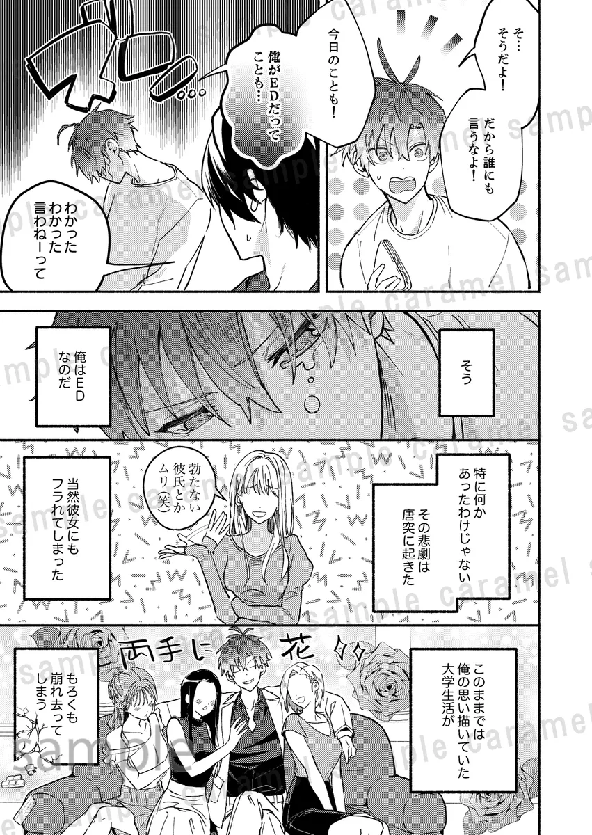 大学でも目を引くイケメン・蓮に突然迫られ、戸惑いながらも抗えない空気に飲み込まれてしまう陽汰。相手があまりにも慣れているように見える一方で、自分は経験もなく、うまく応えられないことに強い劣等感を抱えていた。けれど蓮はそんな陽汰を突き放すどころか、思いがけない提案を持ちかける。実は陽汰には、人に言えない悩みがあった。恋人との関係もうまくいかず、自信を失っていた彼に、蓮は「俺が力になる」と距離を縮めてくる。軽薄そうに見えて、実は人の機微をよく見ている蓮。からかうような態度の裏で、陽汰の弱さや焦りを見抜き、逃げ場のない気持ちに踏み込んでいく。