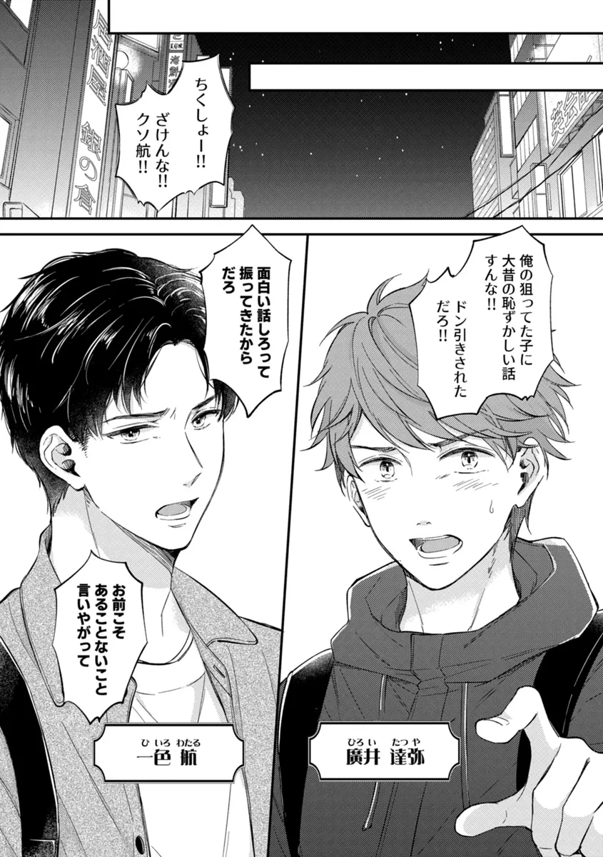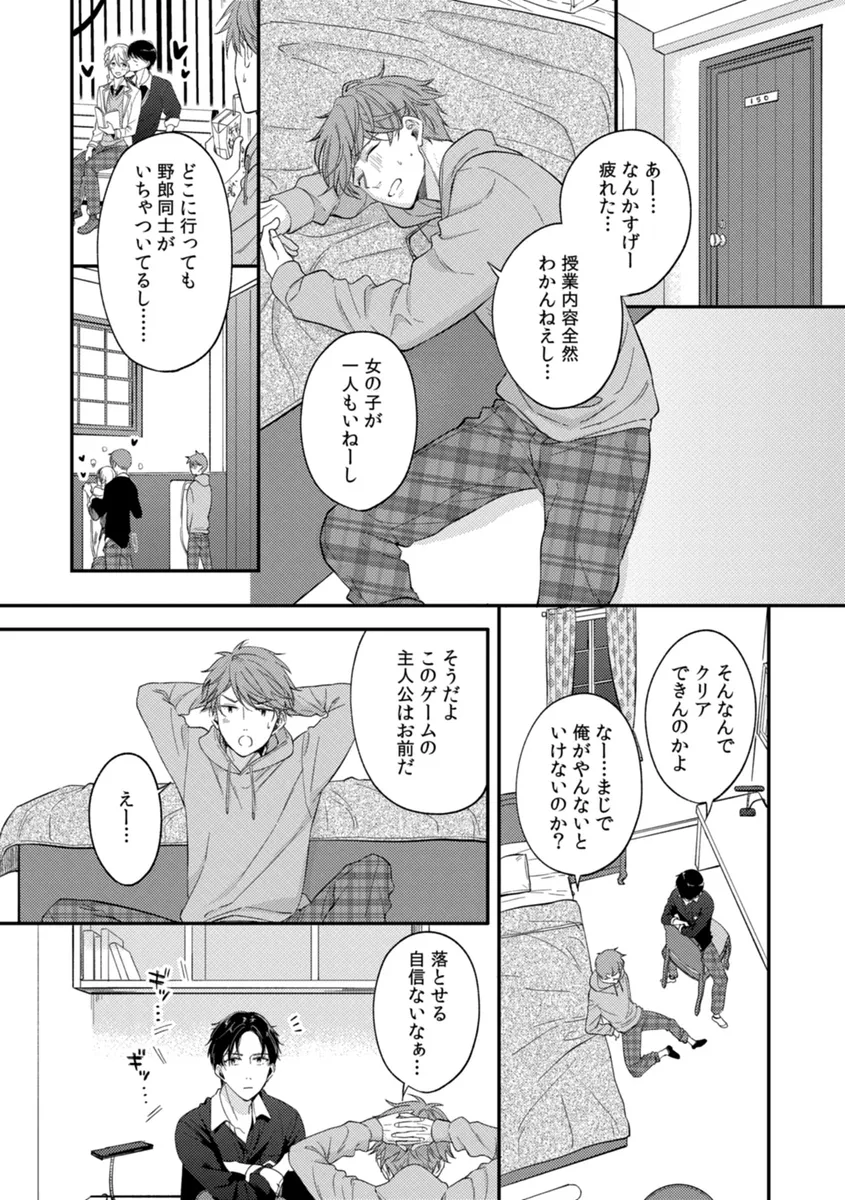 主人公・廣井達弥は、幼なじみの一色航との関係にこじれを抱えたまま日々を過ごしていた。そんなある日、事故をきっかけに目を覚ますと、そこは“成績優秀・眉目秀麗な男子生徒たちが通う学園”を舞台にした恋愛BLゲームのような世界。しかも達弥は、ハッピーエンドの条件として攻略対象と結ばれなければならない状況に放り込まれてしまう。戸惑う達弥のそばには、なぜか現実でも因縁のある航がいて、さらに学園では完璧な生徒会長・卯城聡将まで現れる。男同士の恋愛が当たり前とされる特殊な世界の中で、達弥は強引なアプローチや価値観の違いに振り回されながらも、自分の気持ちと少しずつ向き合っていく。まさか手コキで抜かれるなんて―。