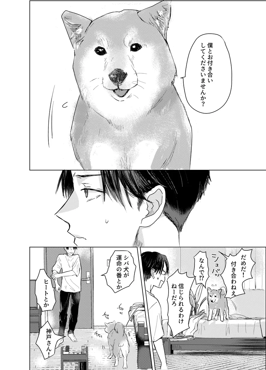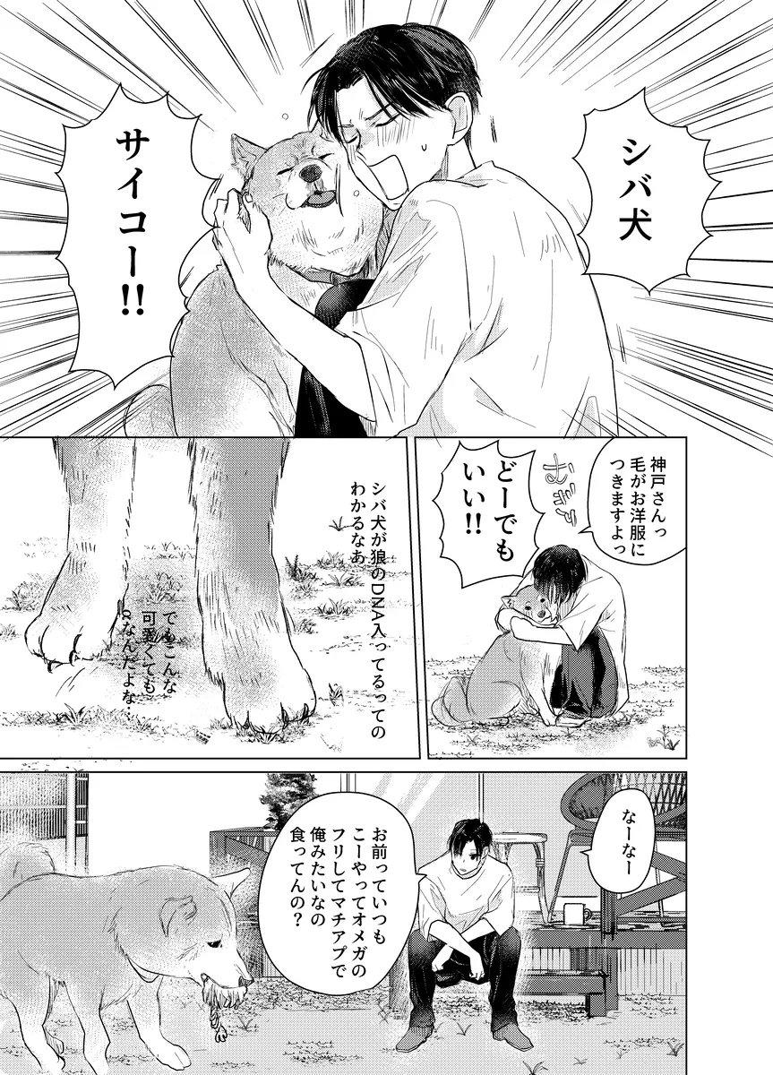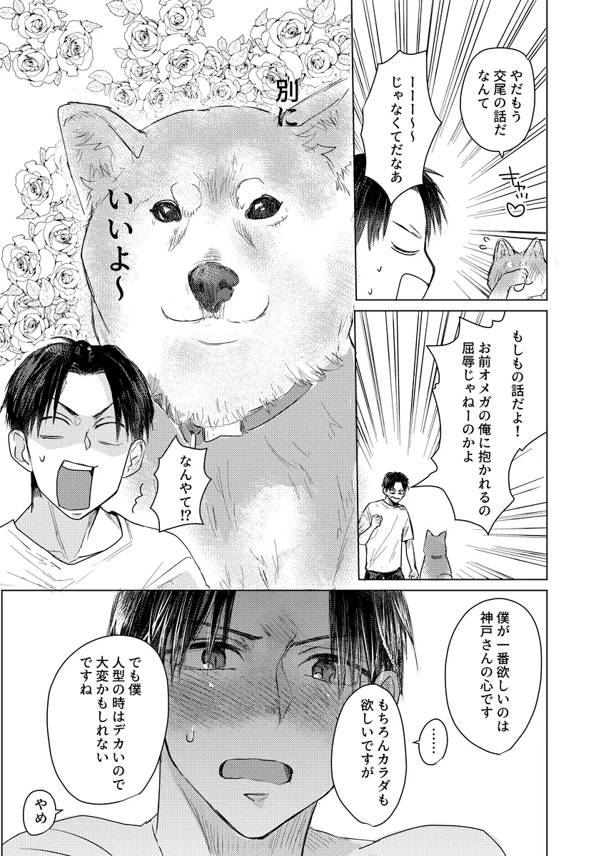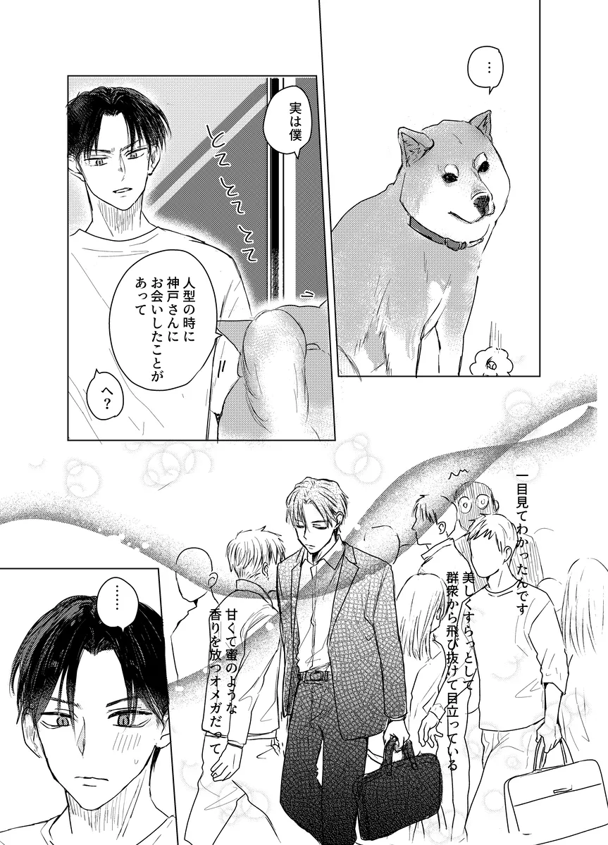 Ωでありながら発情期がなく、184センチの長身を持つ神戸蓮。Ωらしさとは無縁に過ごしていた彼は、ある日、αの芦名北斗から突然熱烈な告白を受ける。芦名は優秀なαでありながら、疲れるとシバ犬になってしまう「先祖返り」の体質持ち。神戸は突然の求愛に戸惑うが、ふわふわで愛らしいシバ犬姿の芦名には抗えず、つい甘やかしてしまう。「僕と番になれば毎日モフり放題ですよ」と真顔で迫る芦名に振り回されながらも、神戸の心は少しずつほぐれていく。Ωらしくない神戸と、犬になってでも一途に想いを伝える芦名の、もふもふ甘い溺愛ラブコメBL。